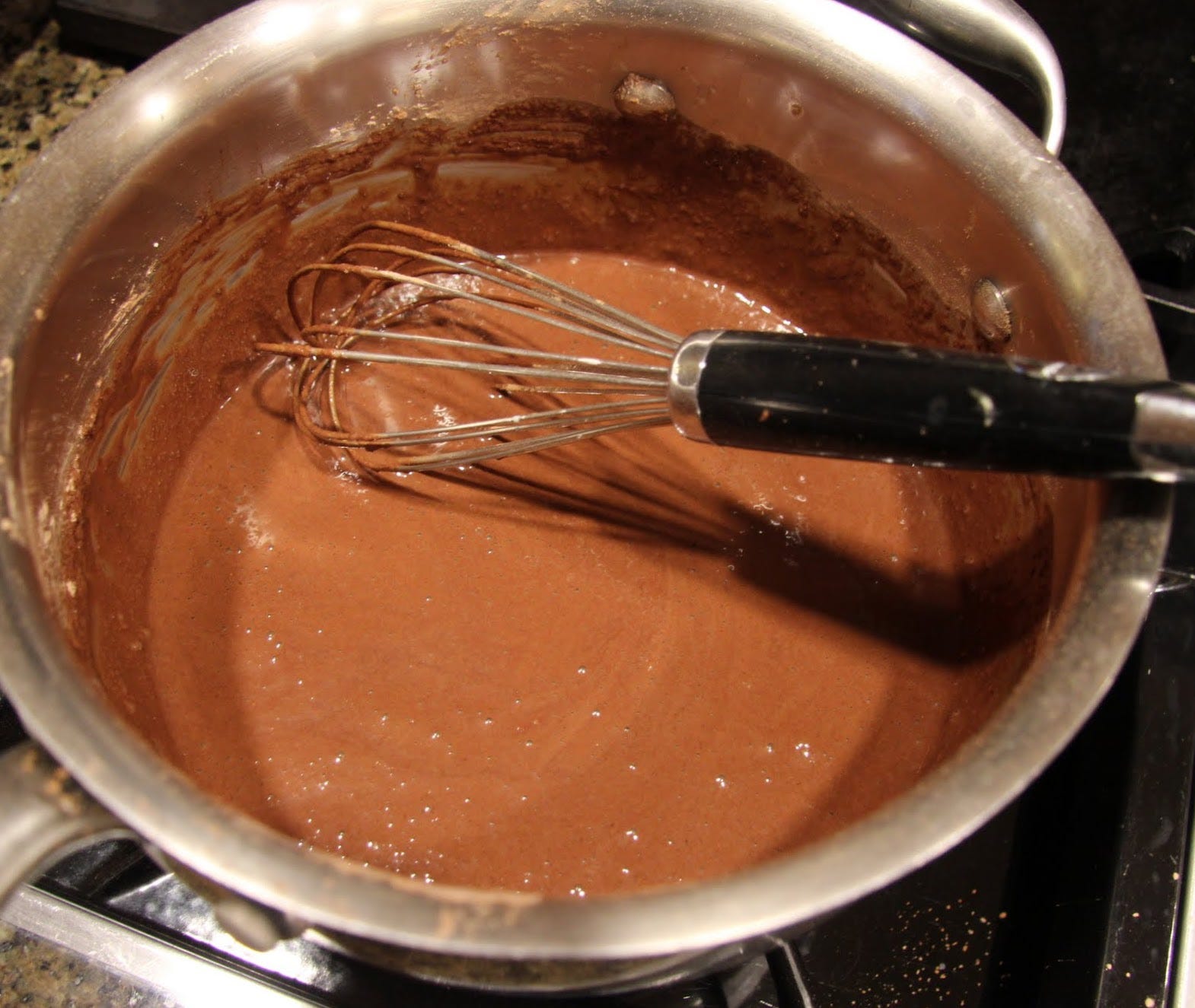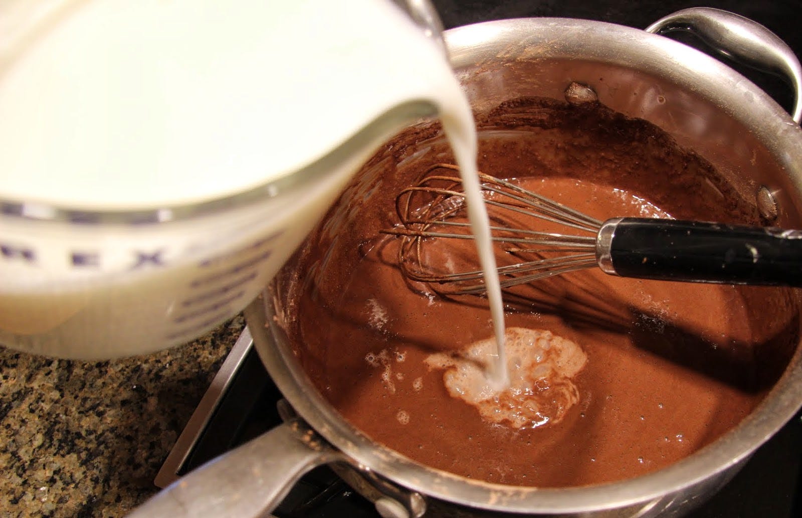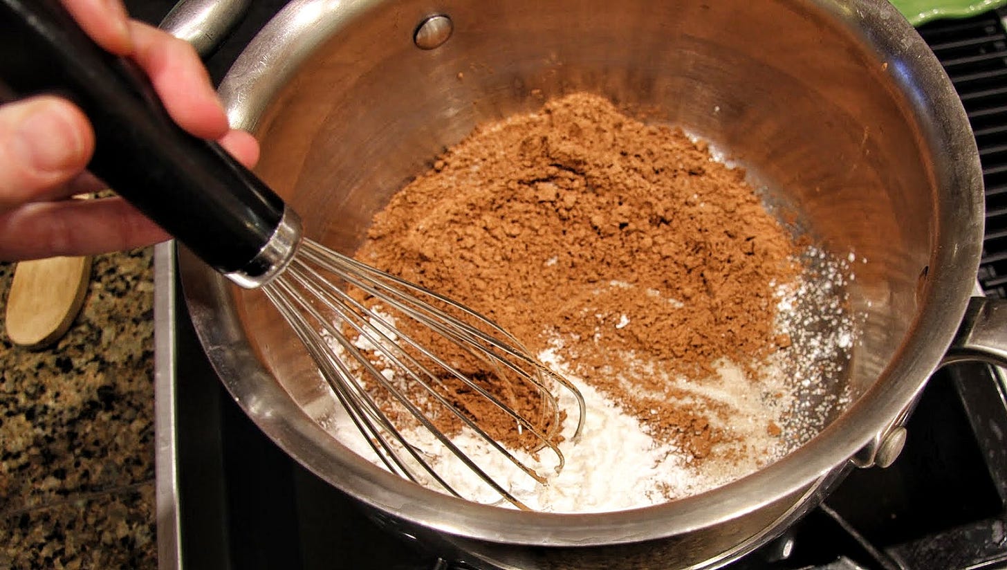 In a large saucepan, whisk together sugar, cocoa powder, cornstarch, and salt until well combined.