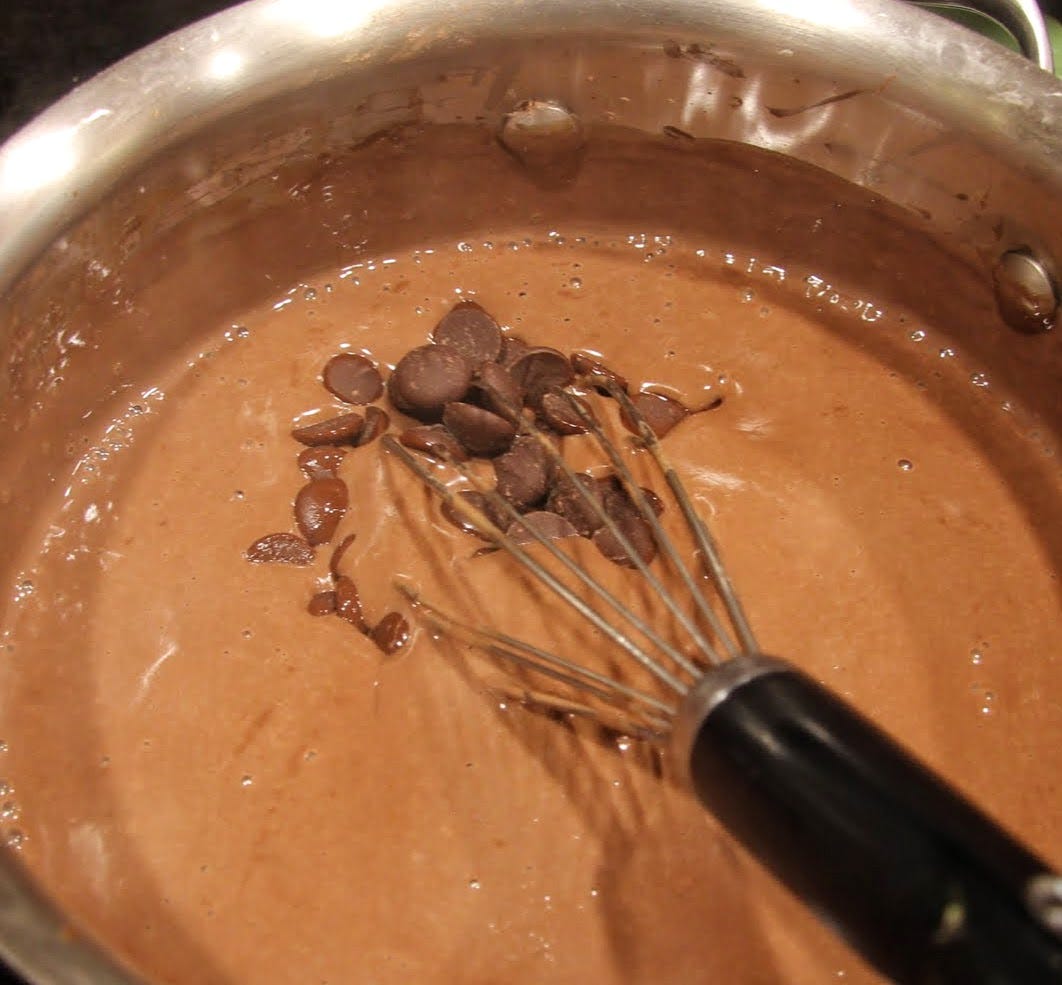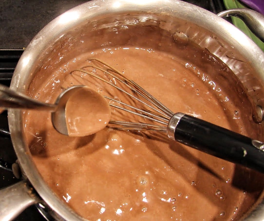 The pudding mixture will be frothy. Turn the heat up to medium and cook, stirring almost constantly to avoid sticking, until the mixture begins to boil.